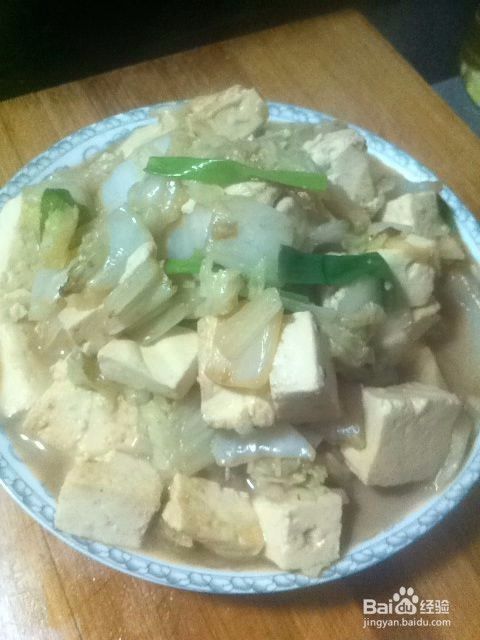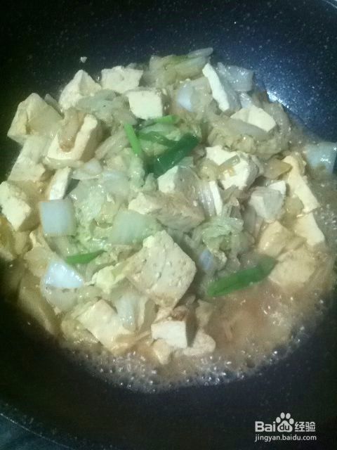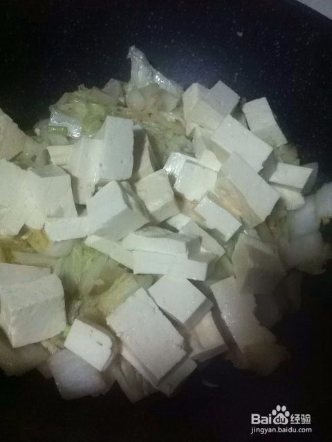 大白菜炒至变软后,豆腐切块下入锅中