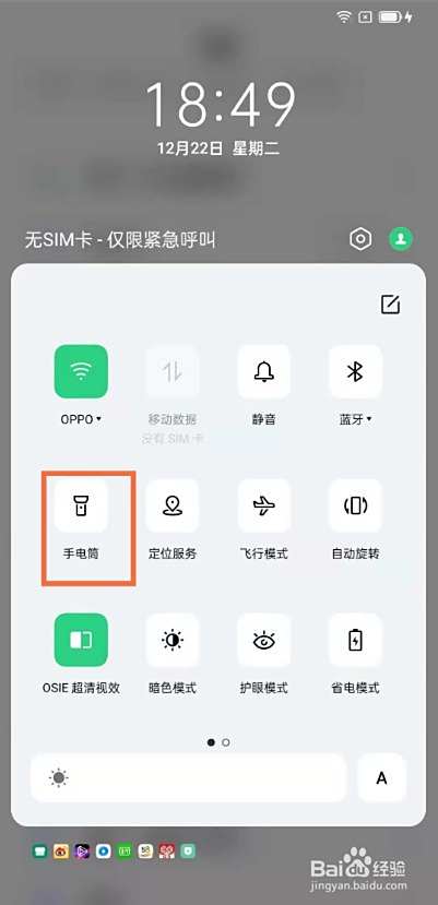 1、从屏幕顶端下拉出状态栏,点击【手电筒】即可。