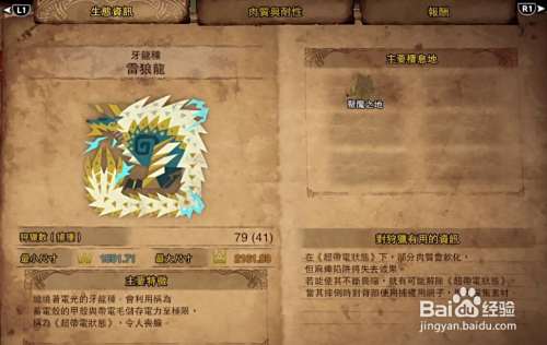 在狩猎时 雷狼龙会很容易触发带电状态 所以近战很容易被电到 建议瘤弹和轻弩等逃课打法 近战建议使用一刀流 不能贪刀