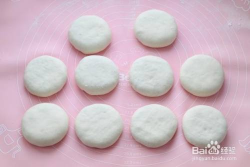 取出面团揉匀排气,切割成均匀的十个面剂子,用掌根按扁。