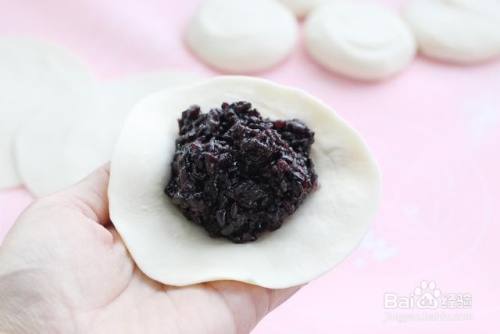 再用擀面杖擀成中间厚、边缘薄的饼皮,取饼皮在中间放上血糯米馅料。