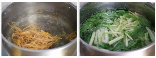 虫草花、白菜焯水,之后捞起备用。