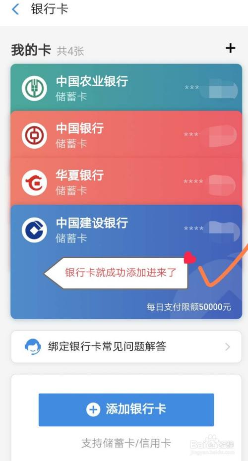 在跳转出的页面我们可以看到已经绑定的银行卡,如果还要绑定其他的银行卡,点击“添加银行卡”