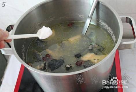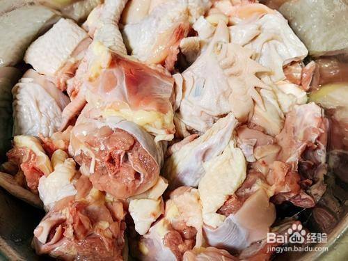 锅内放入鸡块、葱段、姜片和适量水烧开,撇去浮沫,放入榴莲壳和榴莲籽小火炖50分钟。