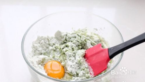 1.将新鲜酵母放进小碗中,倒入纯牛奶混合搅拌均匀,静置五分钟使酵母溶解。没有鲜酵母也可以用干酵母,直接倒入粉类食材中拌匀即可。在容器中放入普通面粉、菠菜粉和细砂糖混合拌匀。接着将酵母水倒进容器中,再磕入一个鸡蛋。