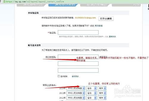 4.填完第三步后,进入到自己的资料填写了,要填你以前QQ用过的密码,一定要填哦,还是就是你用过QQ的地方及申请时间,现在的QQ都可以随便看到Q龄,在QQ资料里可以看到Q龄。如下图: