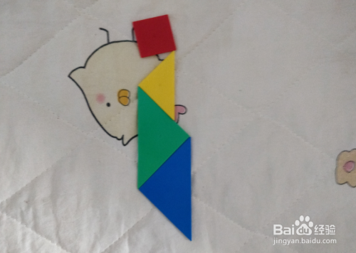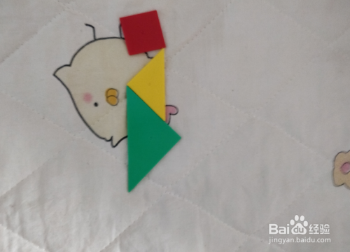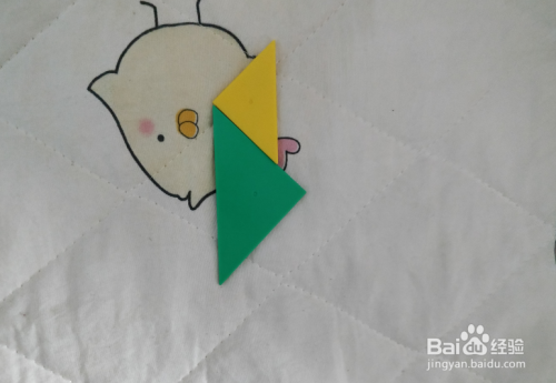 放上黄色三角形,下面放上绿色三角形挨着,如图。