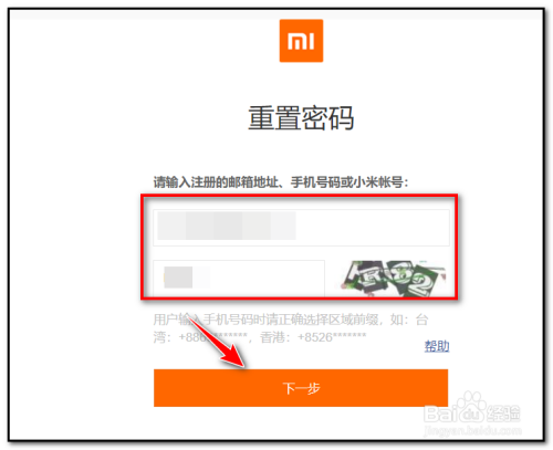 重置密码,输入注册的手机号,邮箱或小米账号,点击“下一步”
