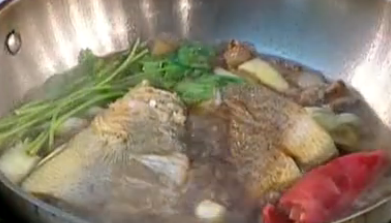 开锅后下入煎好的鱼,放几瓣大蒜,加入红椒,白糖,香菜,盐。