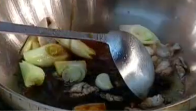 炒锅放油,下五花肉,大葱段,姜片,蒜瓣,两三勺料酒,酱油,5勺子醋,一大勺开水。