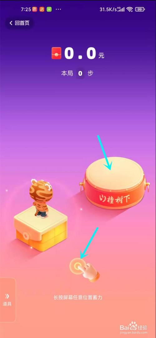 在屏幕任意位置长按进行蓄力,松开手指之后,吉祥物即可跳跃。