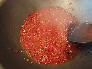 同时开始制作泡椒酱汁。热火下油,放入泡椒和豆豉煸炒