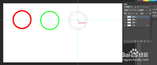 将鼠标放到两条参考线交叉点上,选择“椭圆选框工具”,按住Alt+Shift键绘制以鼠标原点为起点的规则圆形。