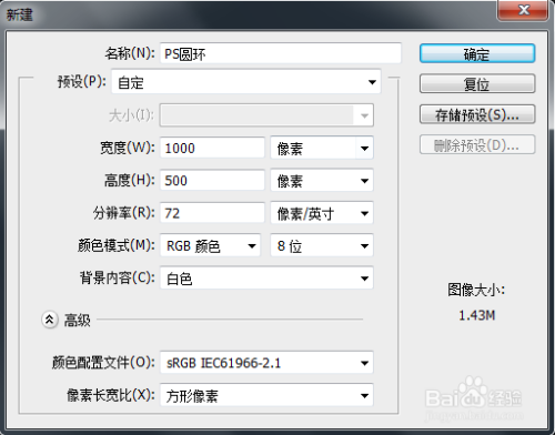 打开PS(这里使用的是CS6版本)软件,新建大小为1000px*500px,背景颜色为白色的文件。