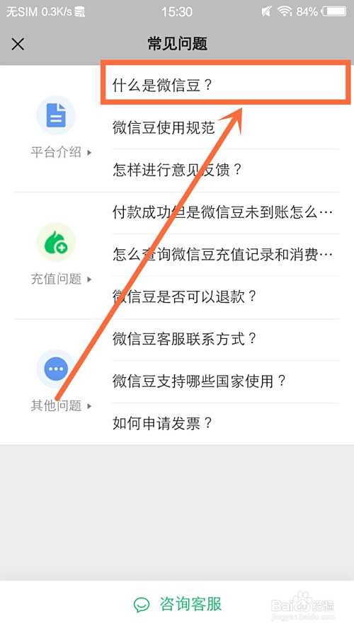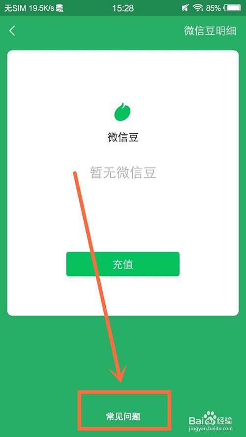 在微信豆界面中,点击最下方的常见问题进入。如图