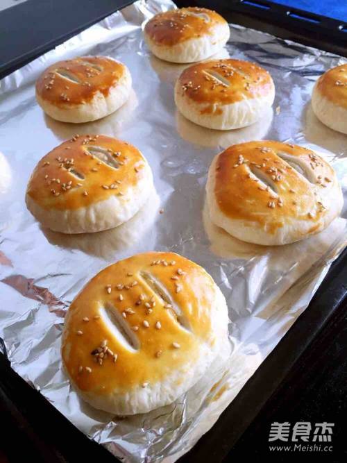 18全部包好后,收口向下,擀成小饼,刷两遍蛋黄液,撒芝麻,用锋利的小刀划两刀口子就可以入烤箱了
