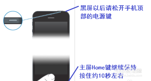 照电源键和home主屏键10秒,10秒钟之后,松开电源键,保持按住home主屏键。