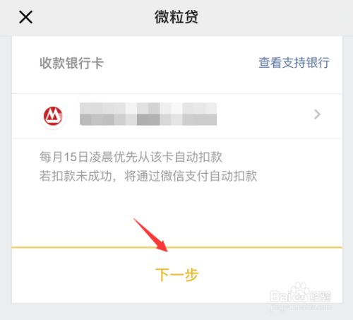 选择收款的银行卡号,也就是每月15号凌晨,微信将从该卡自动扣款,设置完成,点击【下一步】