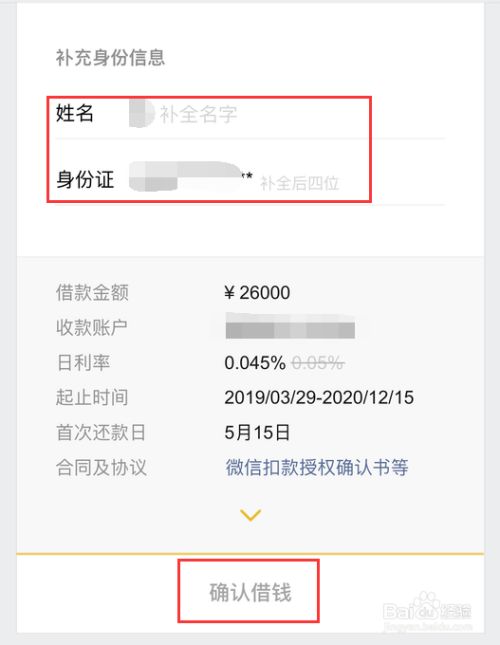 最后补全自己的全名以及身份证号后四位数,点击【确认借钱】即可,等待微粒贷的审核,如果审核成功通过,将会自动放款到微信钱包里面,注意查收即可