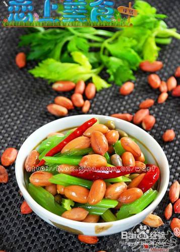 将花生米放入凉水中浸泡2-3个小时,至每粒花生米都吸饱水分锅中放入适量水,将花生米、生姜片、干辣椒、花椒、八角、盐放入煮10分钟左右,然后盖上盖子闷至水凉入味即可将芹菜洗净、去筋、切段,过沸水焯一下,捞出放入凉水中过一下,然后捞出沥干水分备用在煮好的花生米和焯好的芹菜段中加入盐、鸡精、香油拌匀即可