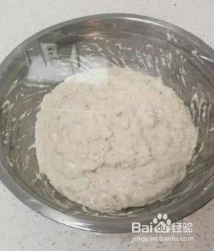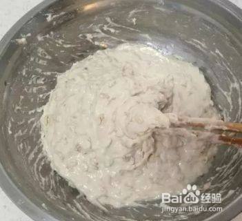 2、把全部食材都倒入盆里,加水搅拌均匀,如果水的用量掌握不好,就一点一点的加,直到搅拌成下图这样的粘稠状态。