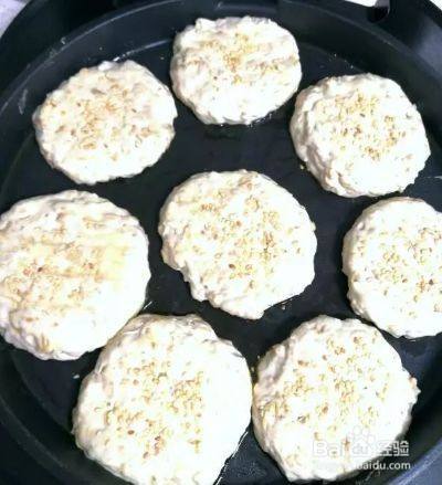 6、取出电饼铛,刷一层薄薄的油膜,然后把半流体混合物分成小块摊平了放进去(不要太厚了,比图中更薄一些会更脆。可以根据个人需求和喜好调整大小。我家人喜欢吃小巧一些的,所以做的小),在上面撒一层白芝麻,盖上锅盖。饼子之间尽量拉开距离,否则出锅的时候可能粘连在一起。