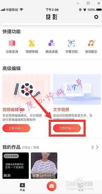 打开手机中的快影,选择“文字视频”下方的“立即开始”。