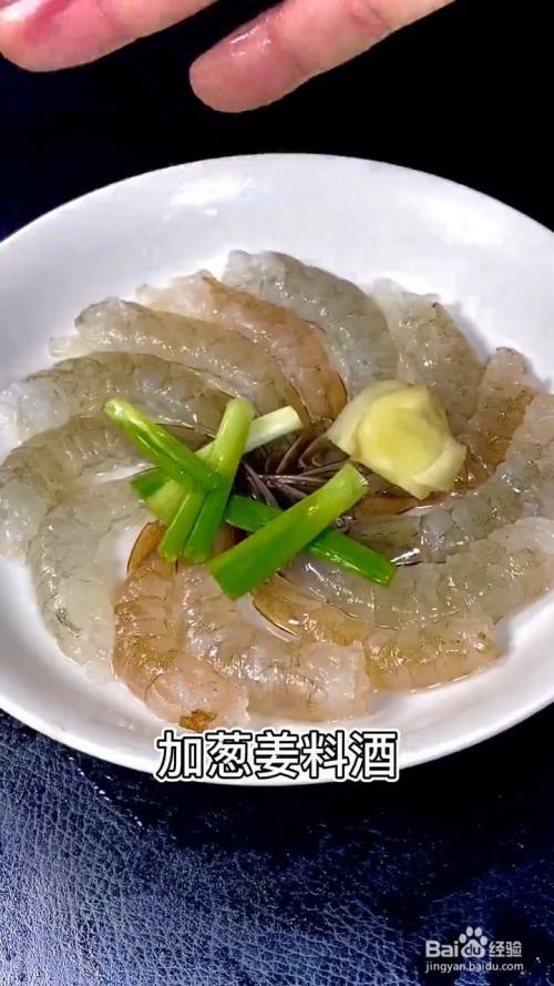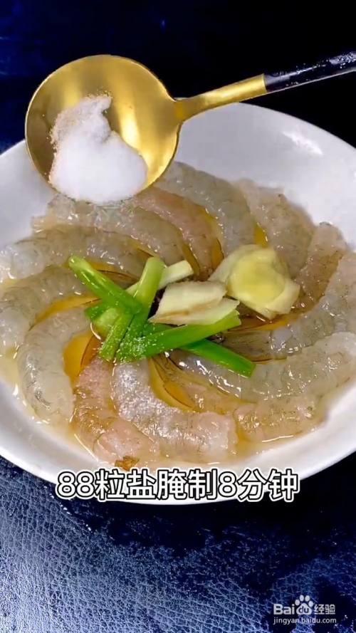 大虾处理干净,去掉虾壳,摆入盘中,加入葱姜,料酒,再加入盐腌制8分钟。