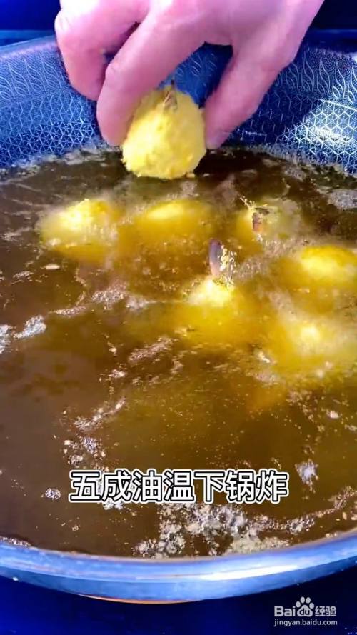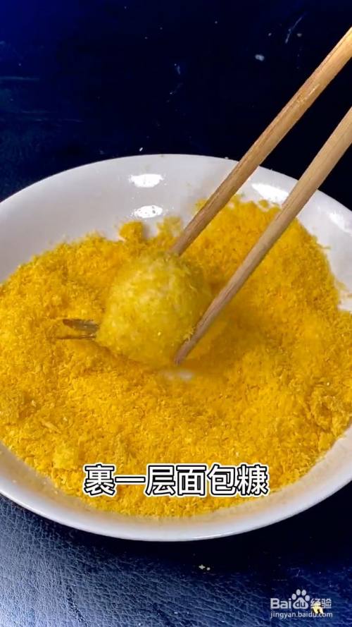 包好后再裹上面包糠,锅中油温五成热下入锅中炸,炸至金黄酥脆浮起捞出。