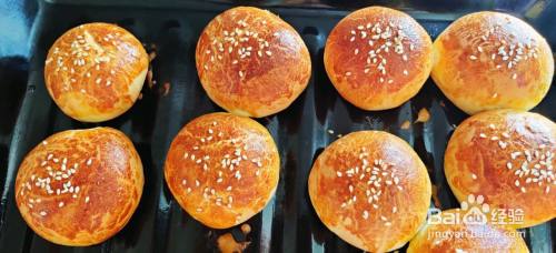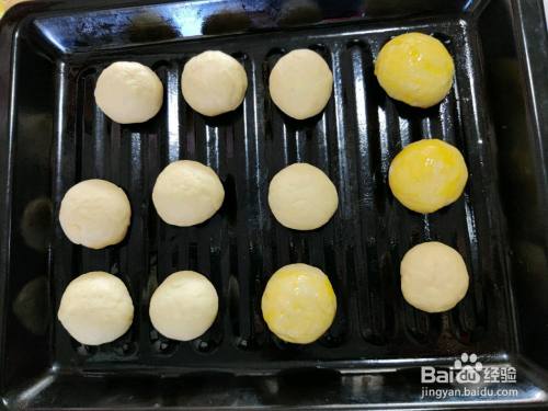 揉好后,放到烤盘中,发酵15分钟,抹上蛋液,撒上芝麻