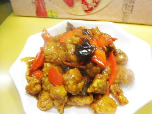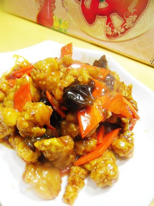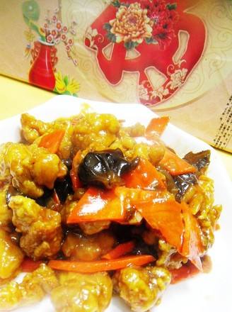 【焦熘鸡块】选择的是鸡腿肉和胡萝卜、木耳搭配烹制而成的一道家常菜。鸡腿经过腌渍、挂糊、炸制后,放入熬制好汁中,快速翻勺,使主辅料裹匀裹附汤汁即成。