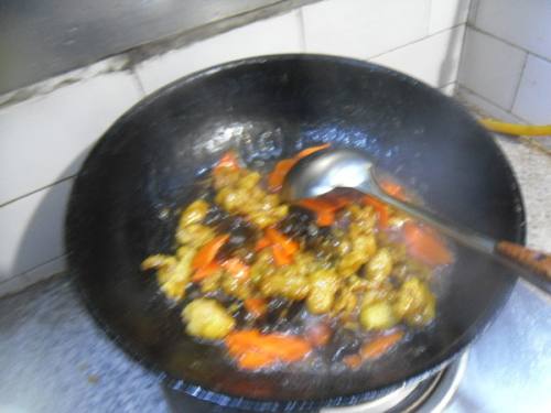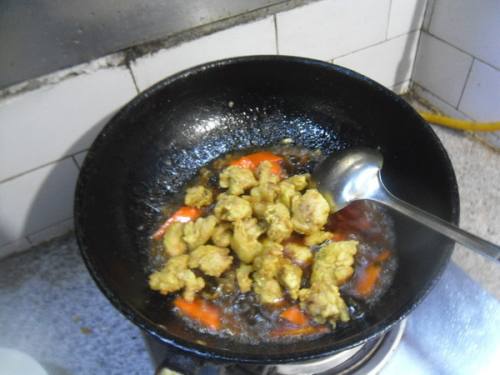 8提高油温5成热以上,放入鸡块,旺火二次复炸,上色后捞出沥净油脂备用