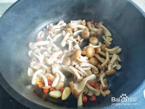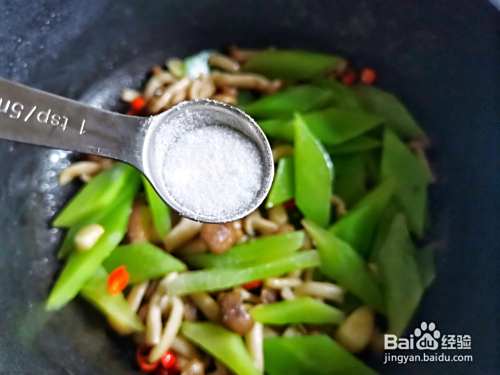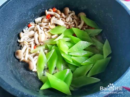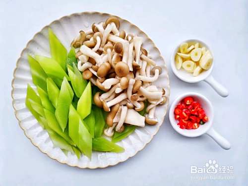 莴笋去皮切厚片,菌菇切去根部洗净,蒜切片小米椒切圈
