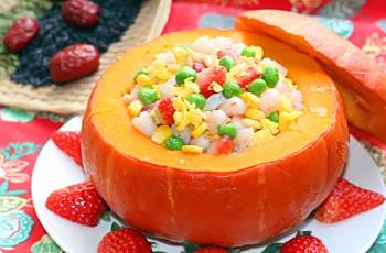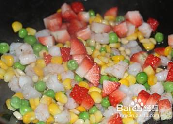 形容农业丰收年景,简单把食材改变了一下,变成了玉米、青豆、松仁、虾仁、草莓、鸡蛋黄,用了乌米饭打底。