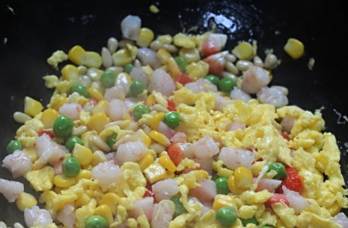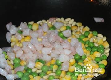 等油起锅了,入玉米、青豆和松仁翻炒再放入虾仁和适量盐