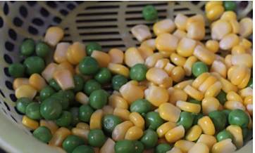 然后将玉米、青豆过水焯,沥干水份待用