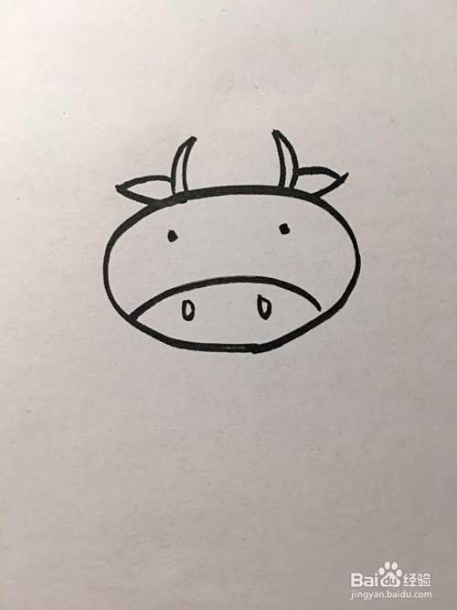 在椭圆形内偏上的位置画两个小圆点,作为牛的眼睛。在椭圆形内偏下的位置画一条向下微弯的曲线,再画两个圈,作为牛的鼻子。