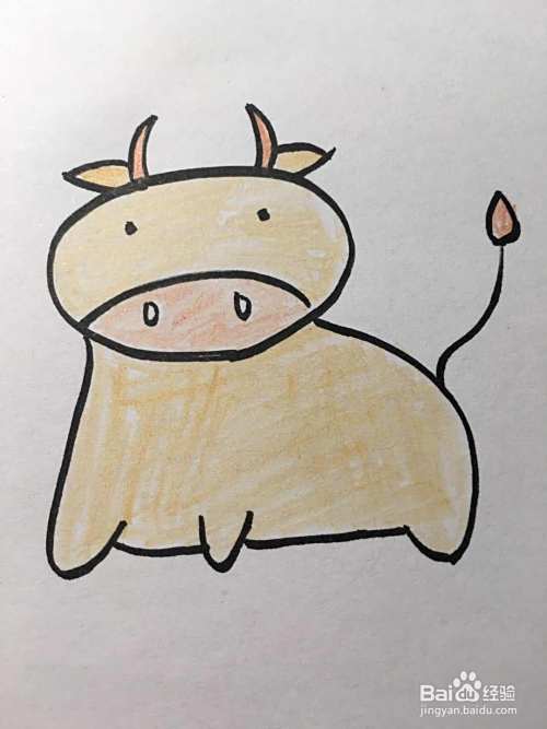 为牛的角、嘴、尾巴涂上棕色,为牛的其他部位涂上深黄色。