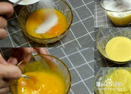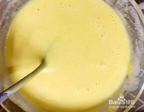 取蛋黄部分将蛋黄打发至微微发白再加入牛奶、白糖、油和再加入的面粉,再搅匀成面糊备用。