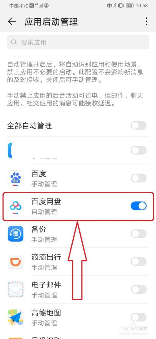 4,进入【应用启动管理】页面,选择某一应用程序,点击关闭【自动管理】开关,在弹出的【手动管理】窗口中,点击管理应用后台运行开关。