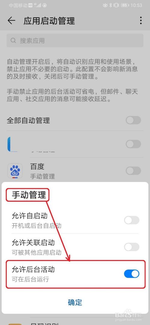 选择关闭具体某一应用程序的【自动管理】开关,在弹出的【手动管理】页面中,选择【后台运行】开关,即可完成华为手机上应用程序后台运行管理过程。如下图所示。