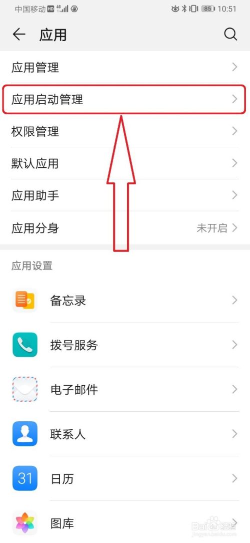 在【应用】设置页面,选择打开【应用启动管理】菜单选项,如下图所示。