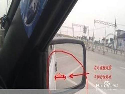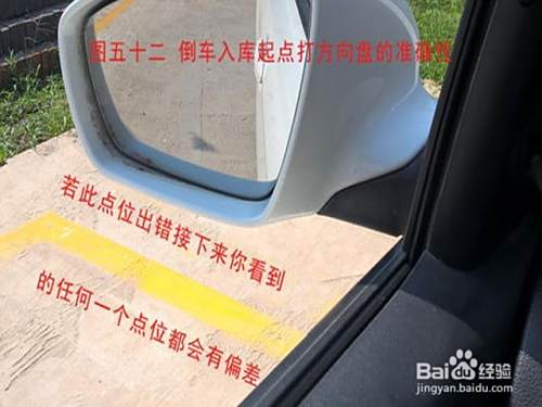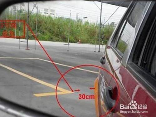 诀窍:当后视镜的下沿,与起点黄线重合时,立即向右打死方向。