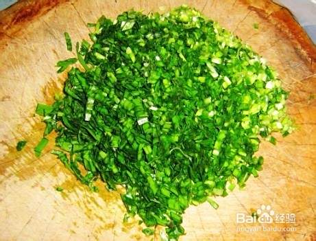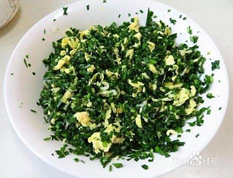 摘洗干净的韭菜放在篦子上,充分控干其中的水分,然后将韭菜切成小碎丁,放入一个盆中,鸡蛋2个,磕入在碗中,搅散打匀后,在锅中添上油,烧热后淋入鸡蛋液快速铲碎炒熟;