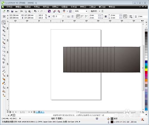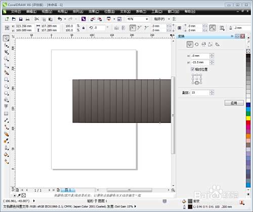 那么图形变成长条后,将图形全部选中,再打开“泊坞窗”中的“变换”,将设置调整为“y为-15.5mm”,而相对位置为“下方的中心”副本为“15”点击应用即可完成设定。