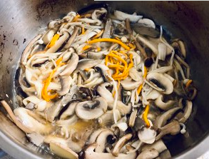 依次放入菌菇,每放一种,都翻炒一下,直到变软后再放下一种。把菌菇都翻炒在一起,期间放入一点点盐,促使菌菇出汤,让味道更加鲜美浓郁。