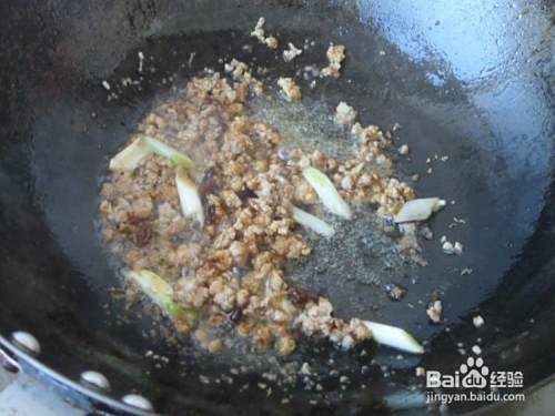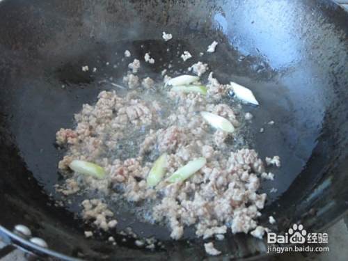 倒入肉末,翻炒一会儿