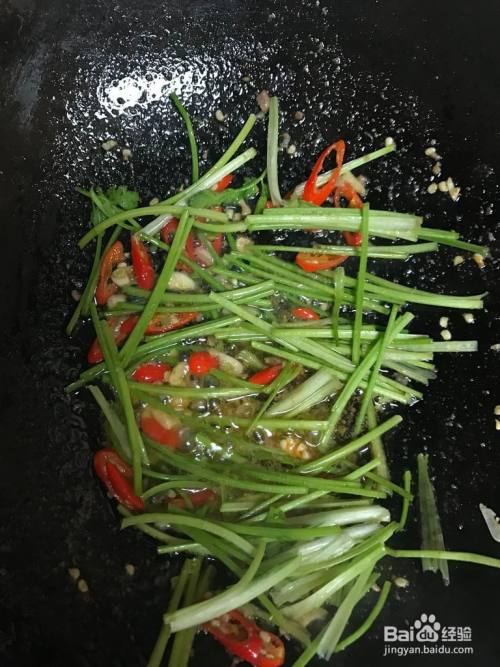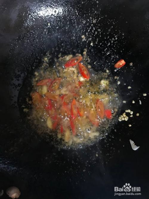 锅内留少量底油,将蒜蓉、米椒滑入爆出香味。