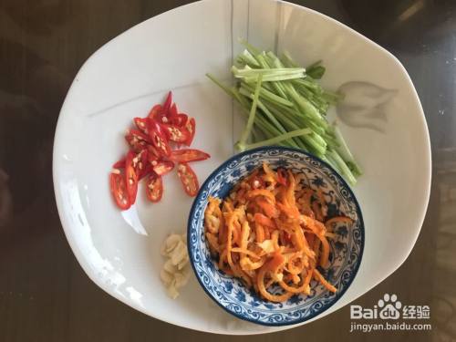 香菜梗切成长段、料椒切丝、大蒜切成蓉。