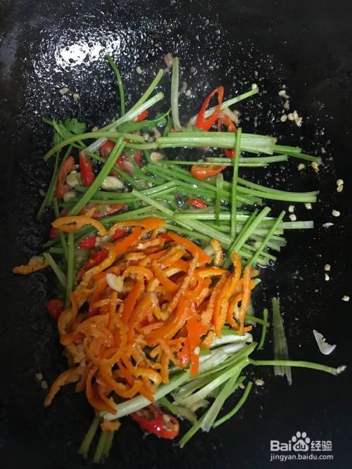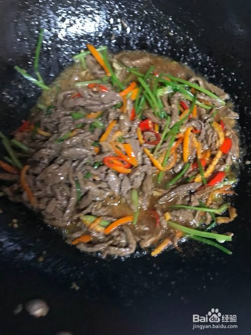 略翻炒后淋入料酒,加入盐和老抽调味上色,最后撒少许鸡精(可不加)起锅。